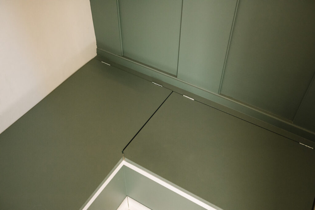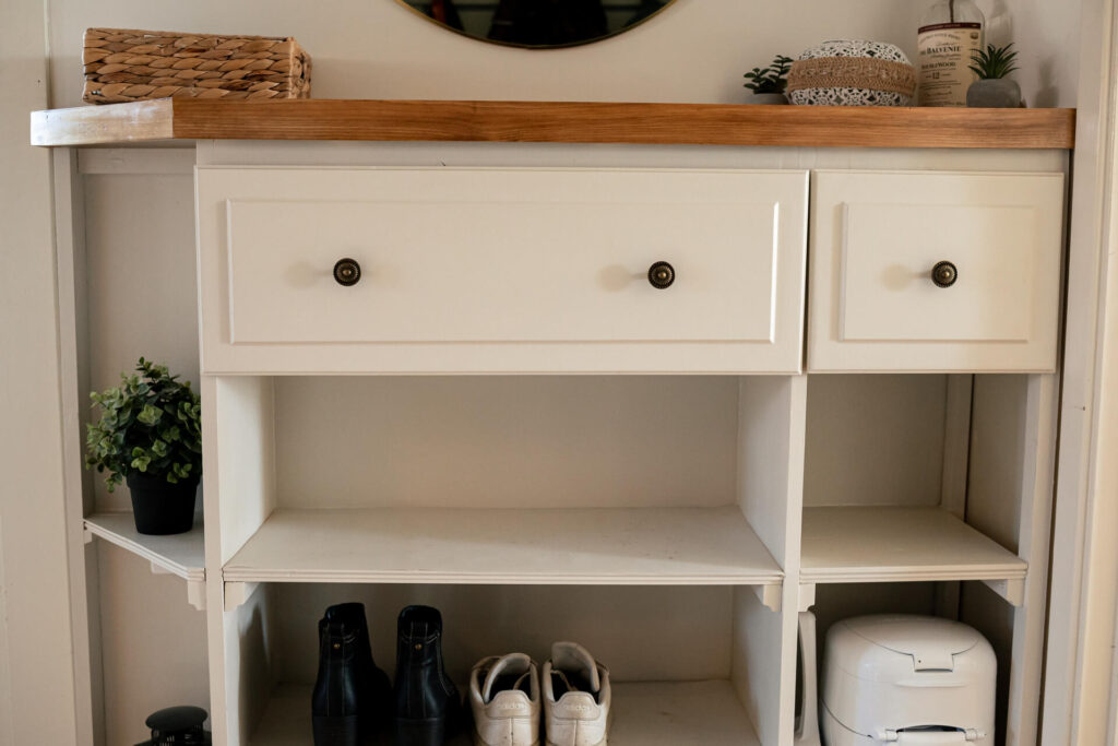 Den här platsbyggda möbeln skapades utifrån ett tydligt behov: att få ordning på skor i en mycket liten hall, utan att kompromissa med funktion eller utrymme. Möbeln utformades därför för att kunna rymma skor på ett prydligt och lättillgängligt sätt, samtidigt som den diskret döljer kattens kattsands-sopkorg.