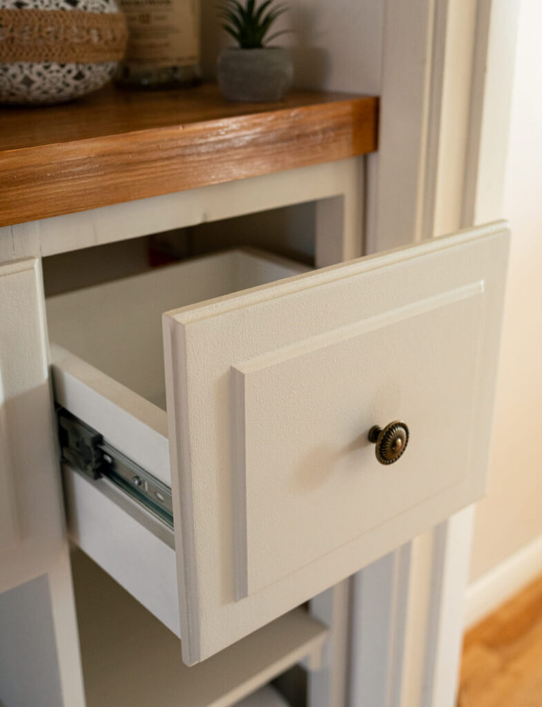 För att ta tillvara på varje centimeter har vi även integrerat lådor för förvaring av telefoner, nycklar och andra småsaker som ofta behöver en fast plats i hallen. Resultatet är en kompakt möbel som trots sitt begränsade djup fyller flera funktioner och hjälper till att hålla hallen organiserad och harmonisk.