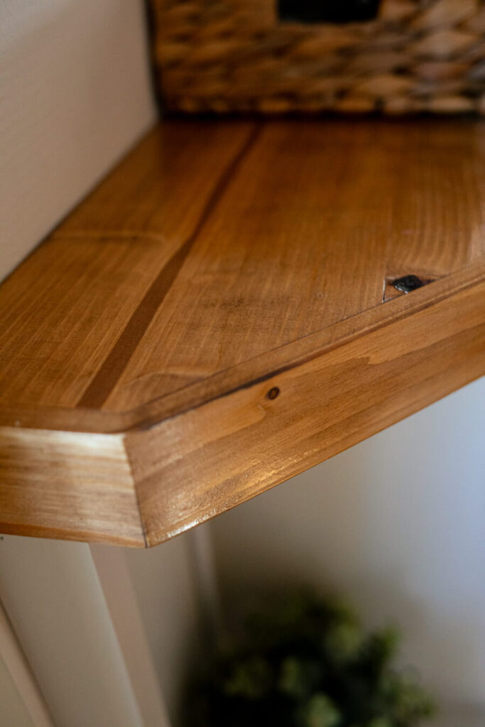Bordsskivan bets-lackades för att ge en slitstark och varm yta. Själva möbeln målades i en harmonisk, ljus kulör från FlüggerOat – som ger ett mjukt och naturligt uttryck som passar väl i hallens begränsade utrymme.
