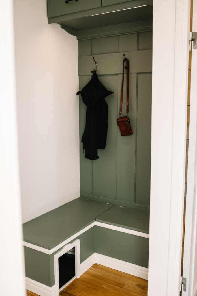 Denna platsbyggda hallmöbel är designad för en trång hall där funktion och ordning är avgörande. Den gömmer kattlådan på ett diskret sätt samtidigt som den erbjuder plats för vantar, mössor, jackor och till och med kattsand – allt utan att ta för mycket utrymme.