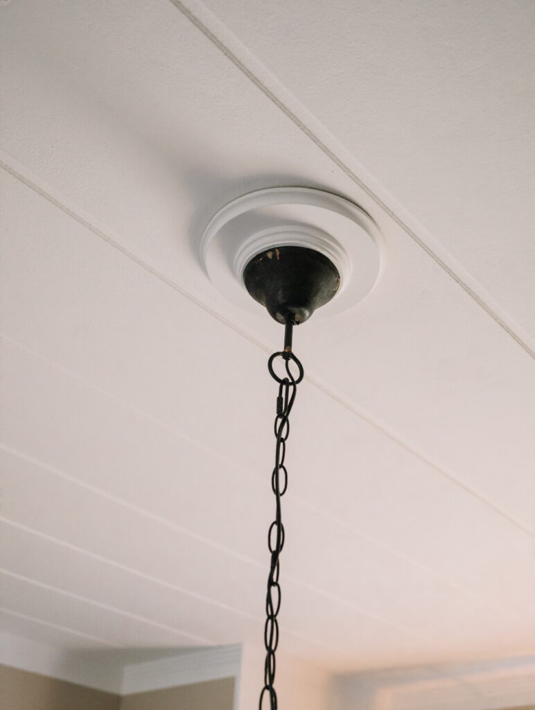 Denna takrosett, både cirkelformad och kvadratisk, är tillverkad i MDF och har vackra fräsningar som ger djup och elegans. Ursprungligen föddes idén som ett enkelt sätt att dölja ett hål i taket som man inte ville ta tag i just då – men resultatet blev istället en fantastisk och dekorativ detalj som lyfter hela rummet.